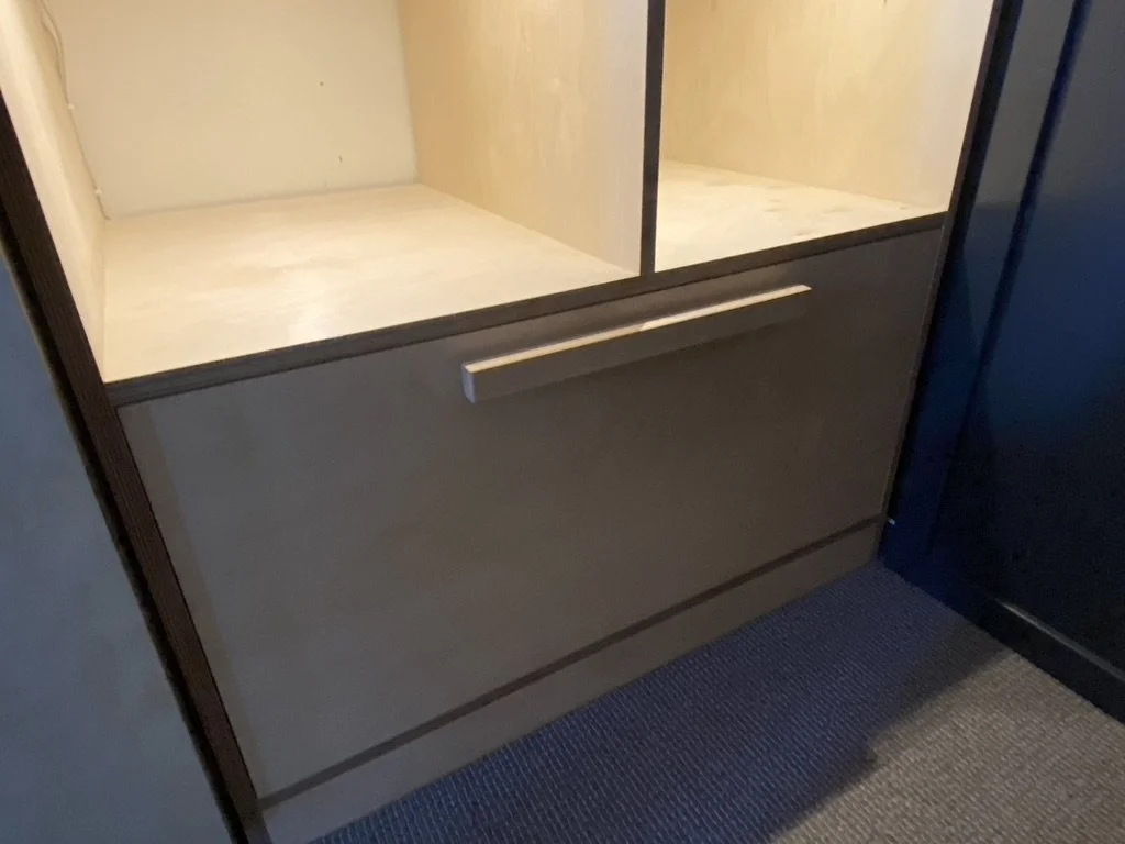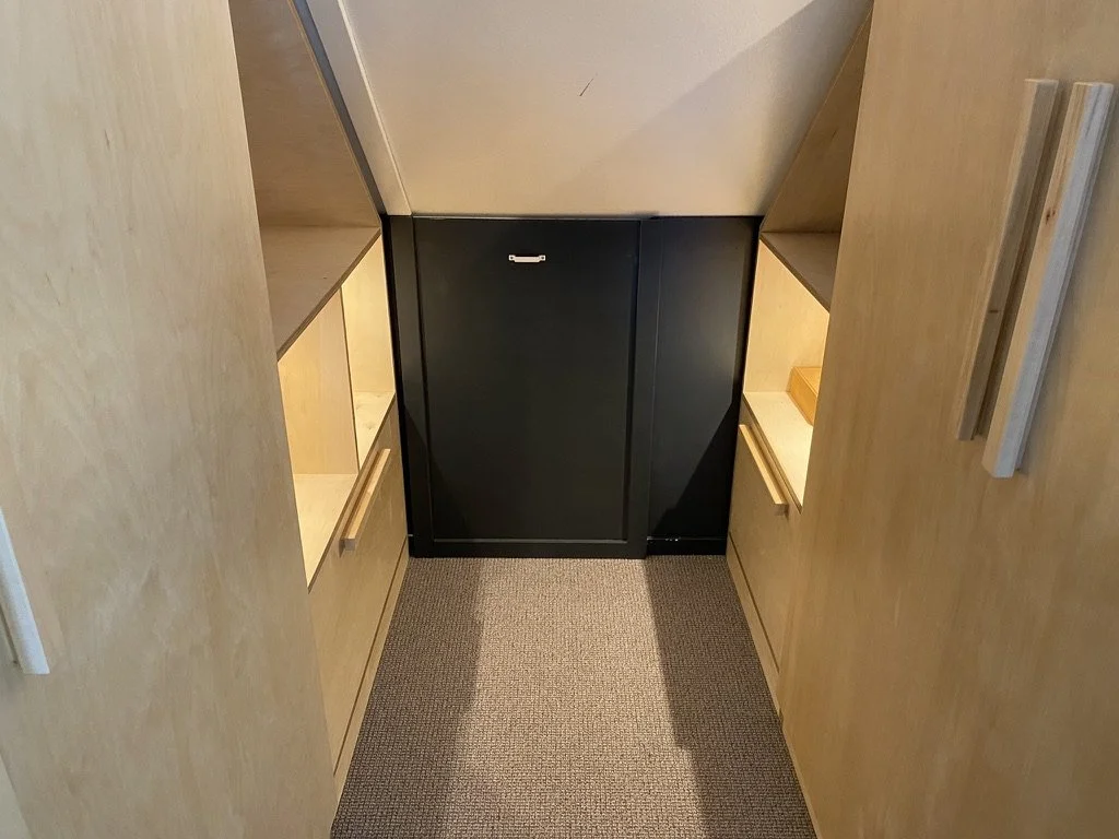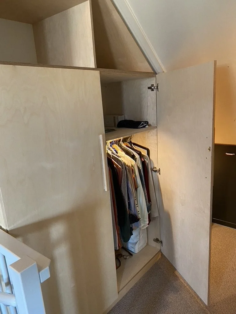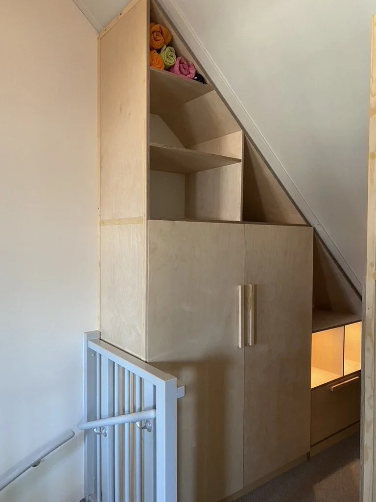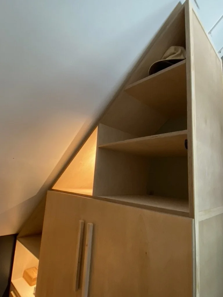 Simpel en functioneel. Deze kast maakte Titus begin 2023 op een zolder in Weesp. De opdracht was om de beschikbare ruimte zo efficiënt mogelijk in te delen. Enkele vakken zijn voorzien van LED verlichting.